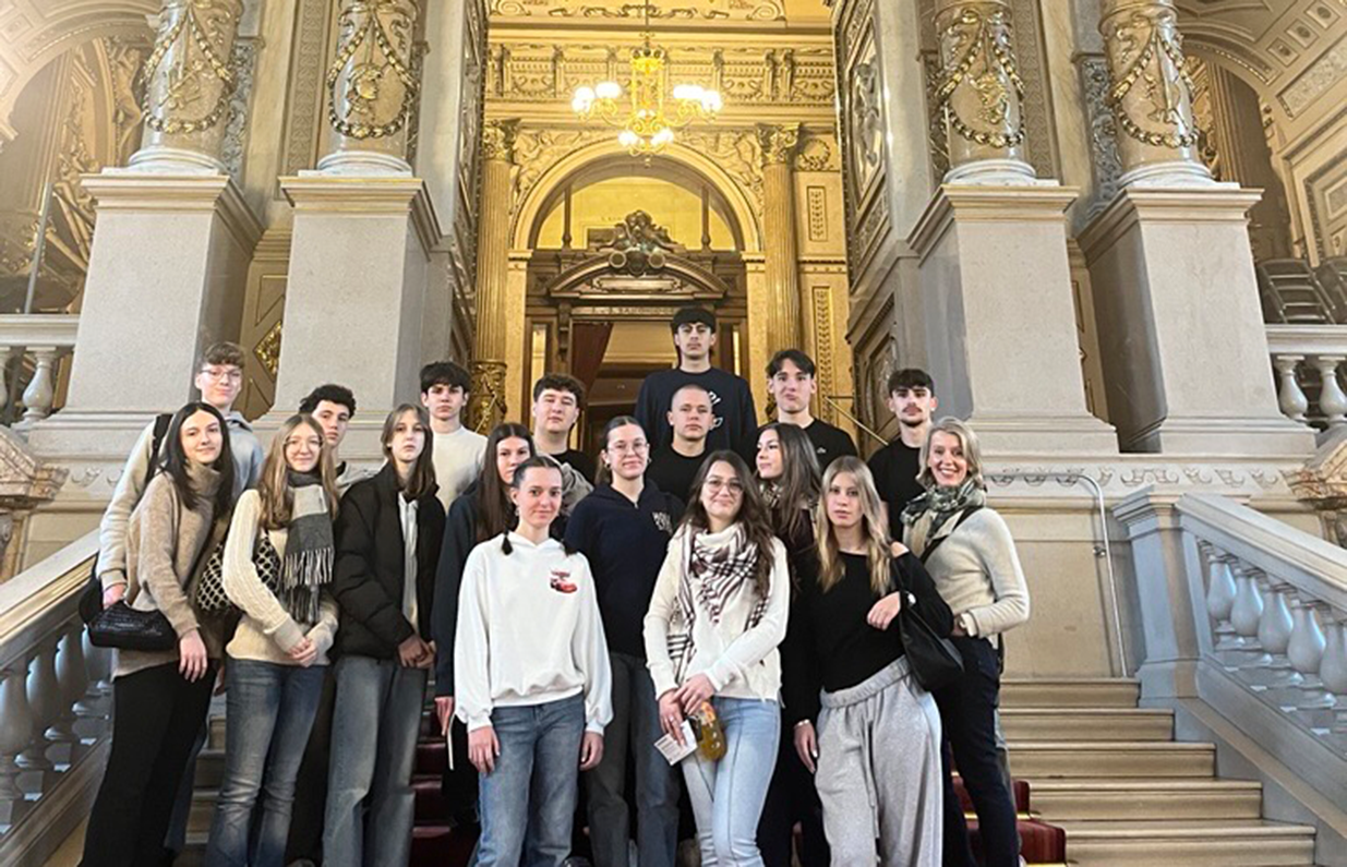 Im Burgtheater erhielten die Schülerinnen und Schüler spannende Einblicke hinter die Kulissen und durften sogar die Bühne betreten – ein außergewöhnliches Erlebnis. In der Ehrengalerie beeindruckten die Porträts der Ensemblemitglieder sowie die eindrucksvollen Deckengemälde von Gustav Klimt und Franz Matsch.