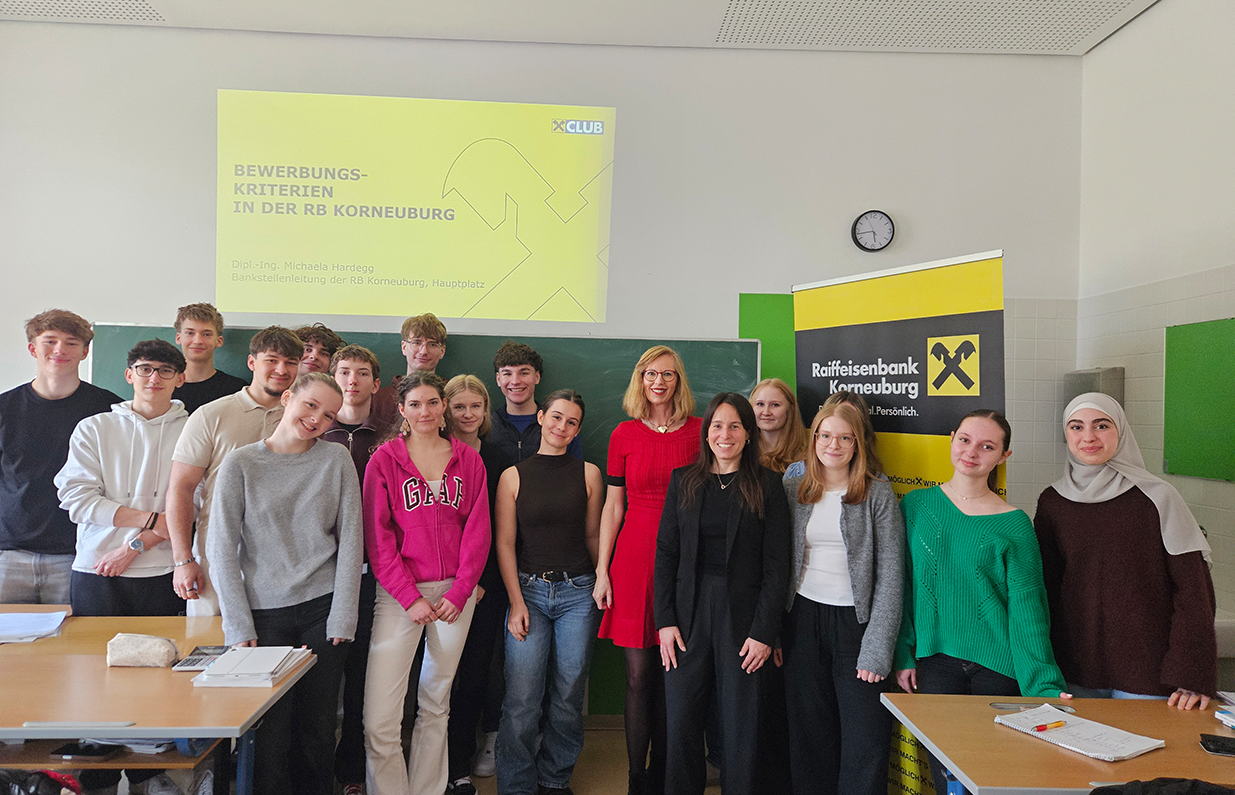Bankstellenleiterin Dipl.-Ing. Michaela Hardegg war am 25.2.2026 zu Besuch in der 3DK und gab den Schüler:innen spannende Einblicke in die Bewerbungskriterien und Karrieremöglichkeiten bei der Raiffeisenbank Korneuburg. Von Persönlichkeit über Engagement bis hin zu Teamgeist – es sind vor allem die Softskills, die für die Raiffeisenbank entscheidend sind.