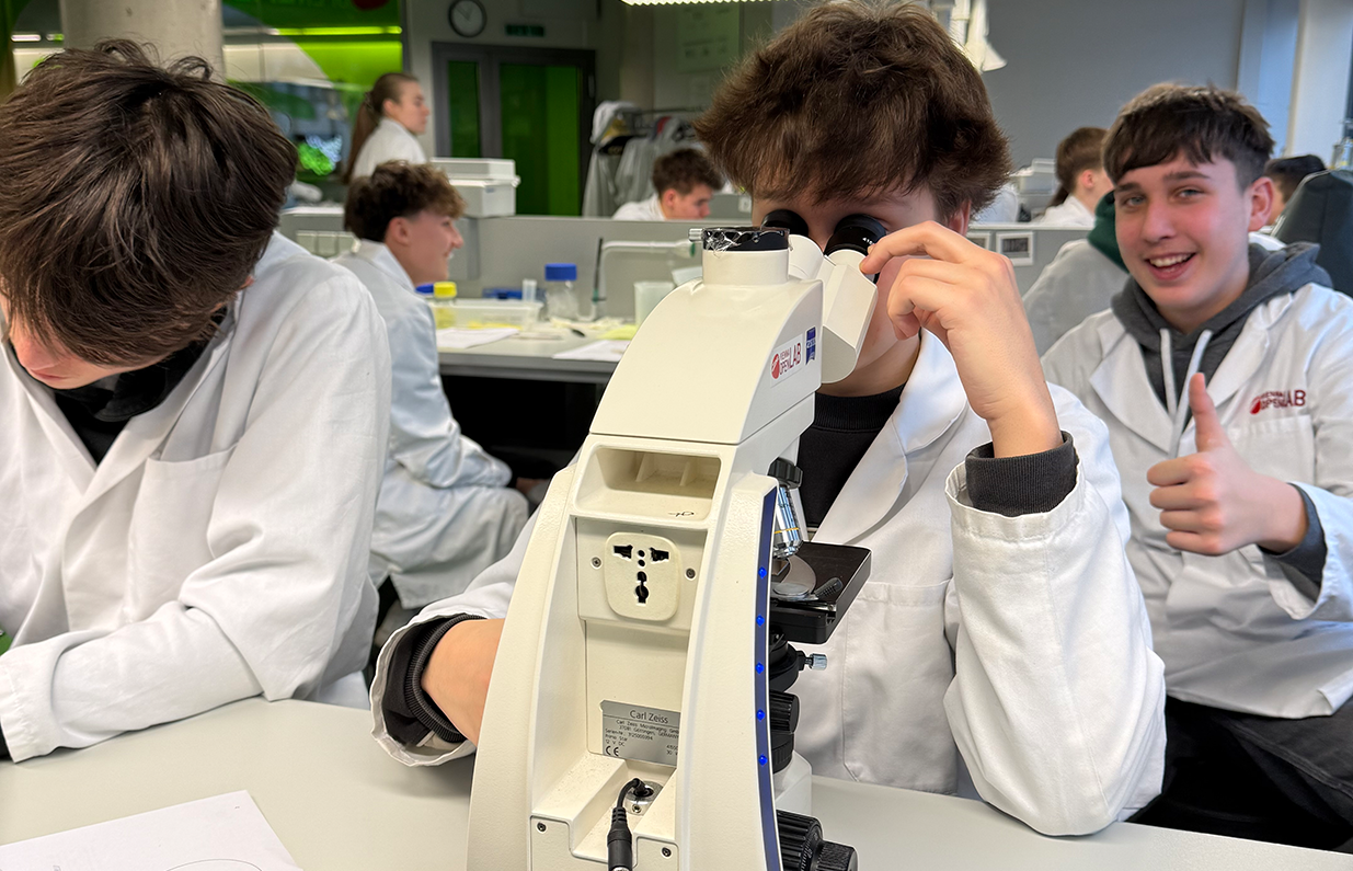 Im Labor nahmen wir am Programm „DNA Atelier“ teil. Zu Beginn wurde gemeinsam das Wissen über Zellen wiederholt, sowie die Funktionsweise des Mikroskops vorgestellt, bevor wir mit dem Mikroskopieren von Pflanzenzellen begannen. Mithilfe einer Zwiebel durften wir in Kleingruppen selbst ein Mikroskoppräparat aus Zwiebelhautzetteln herstellen, um dieses dann unter dem Mikroskop zu betrachten. Im nächsten Schritt betrachteten wir unsere eigenen Mundschleimhautzellen.