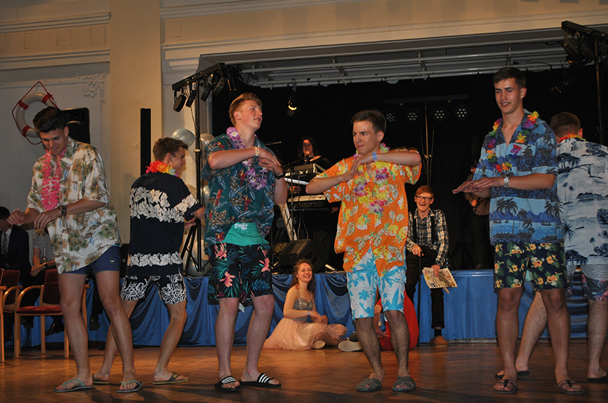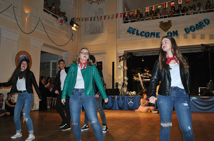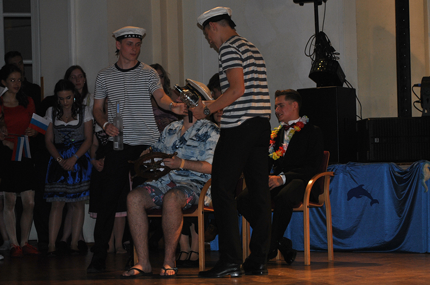 Höhepunkt der Ballnacht war zweifelsohne die Mitternachtseinlage der SchülerInnen der dritten und vierten Jahrgänge. Sie entführten die Ballbesucher auf eine Kreuzfahrt von Frankreich über Griechenland, Hawaii und Russland nach Deutschland und lösten durch Tanzeinlagen Beifallstürme aus.